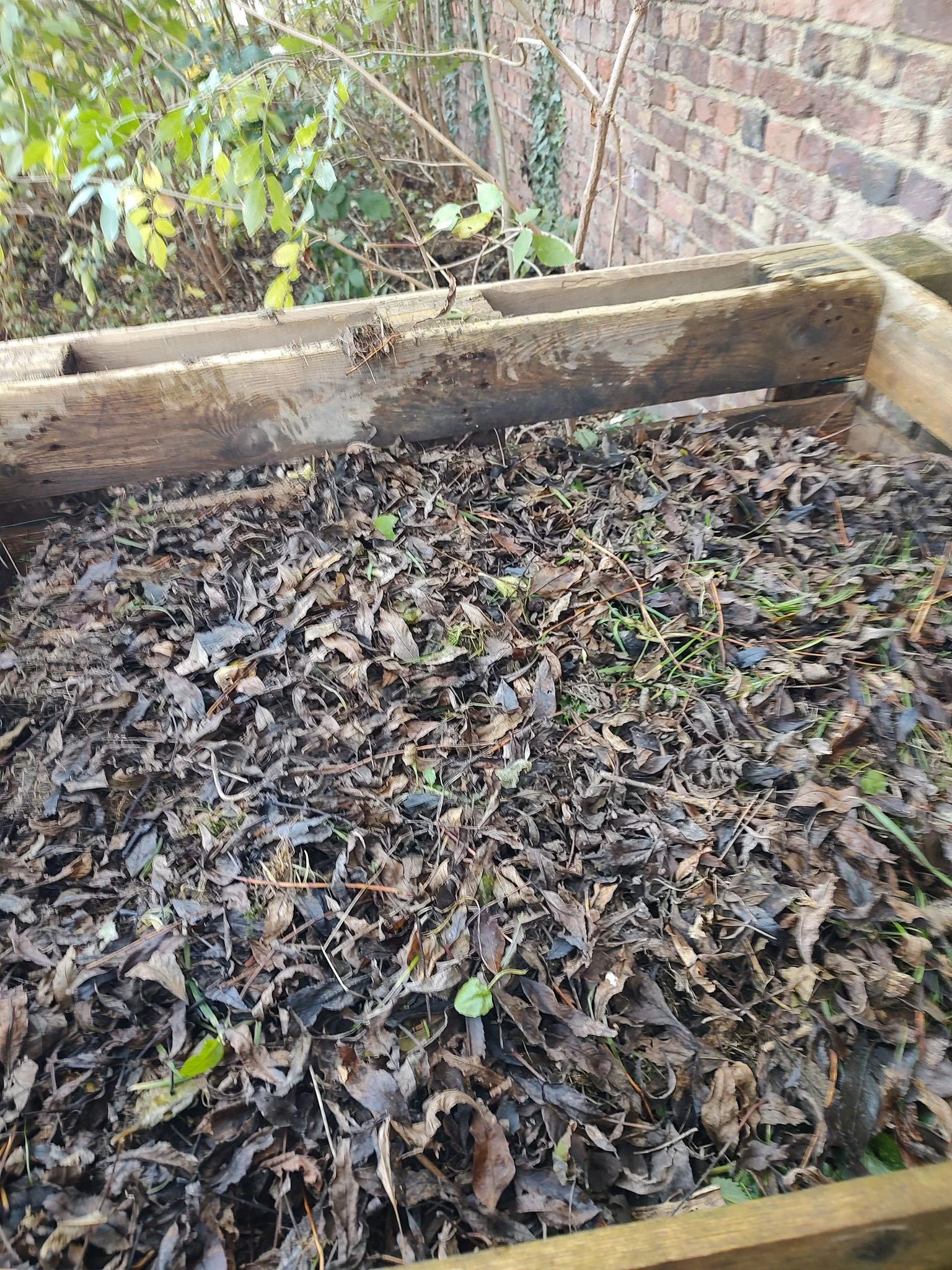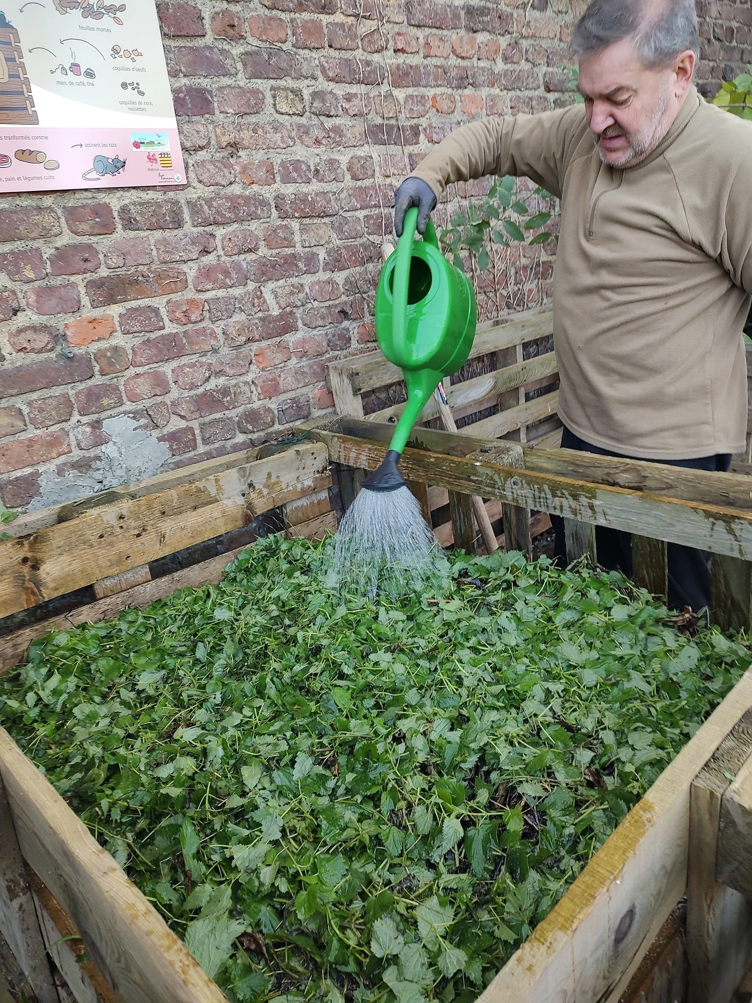 Dans le second bac, nous avons mis une couche de feuilles sèches, coupé les derniers déchets verts en petits morceaux puis ajouté des orties coupées comme activateur. Nous avons bien arrosé puis fermé en mettant une palette dessus.