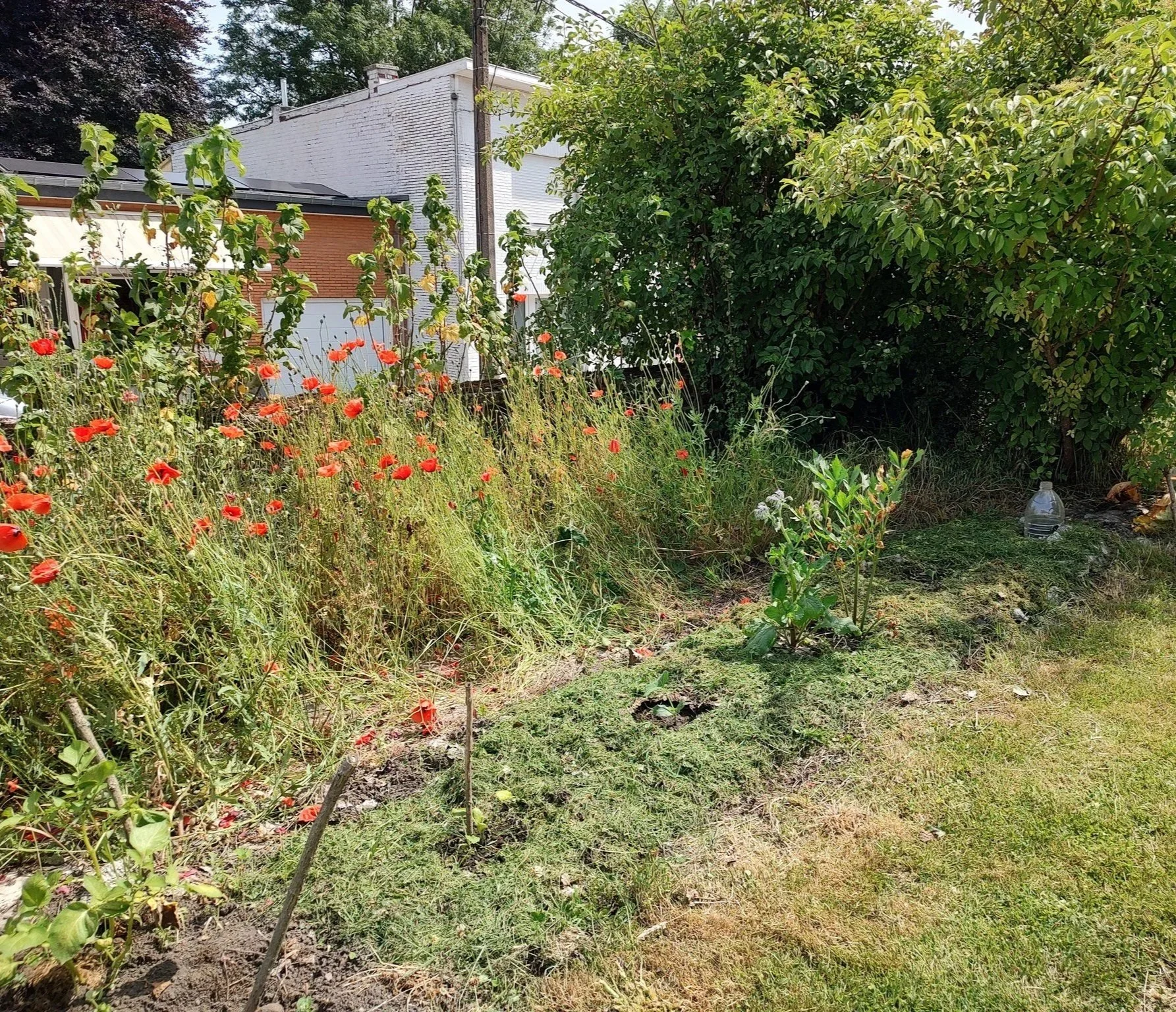 Nous avons aussi couvert les surfaces. Dès la fin de la récolte, nous découpons les végétaux verts disponibles en morceaux (ici Phacélie) puis couvrons de compost et de feuilles. Les carrés potagers et quelques plants (framboisier, rhubarbe, silphies) ont été couverts.