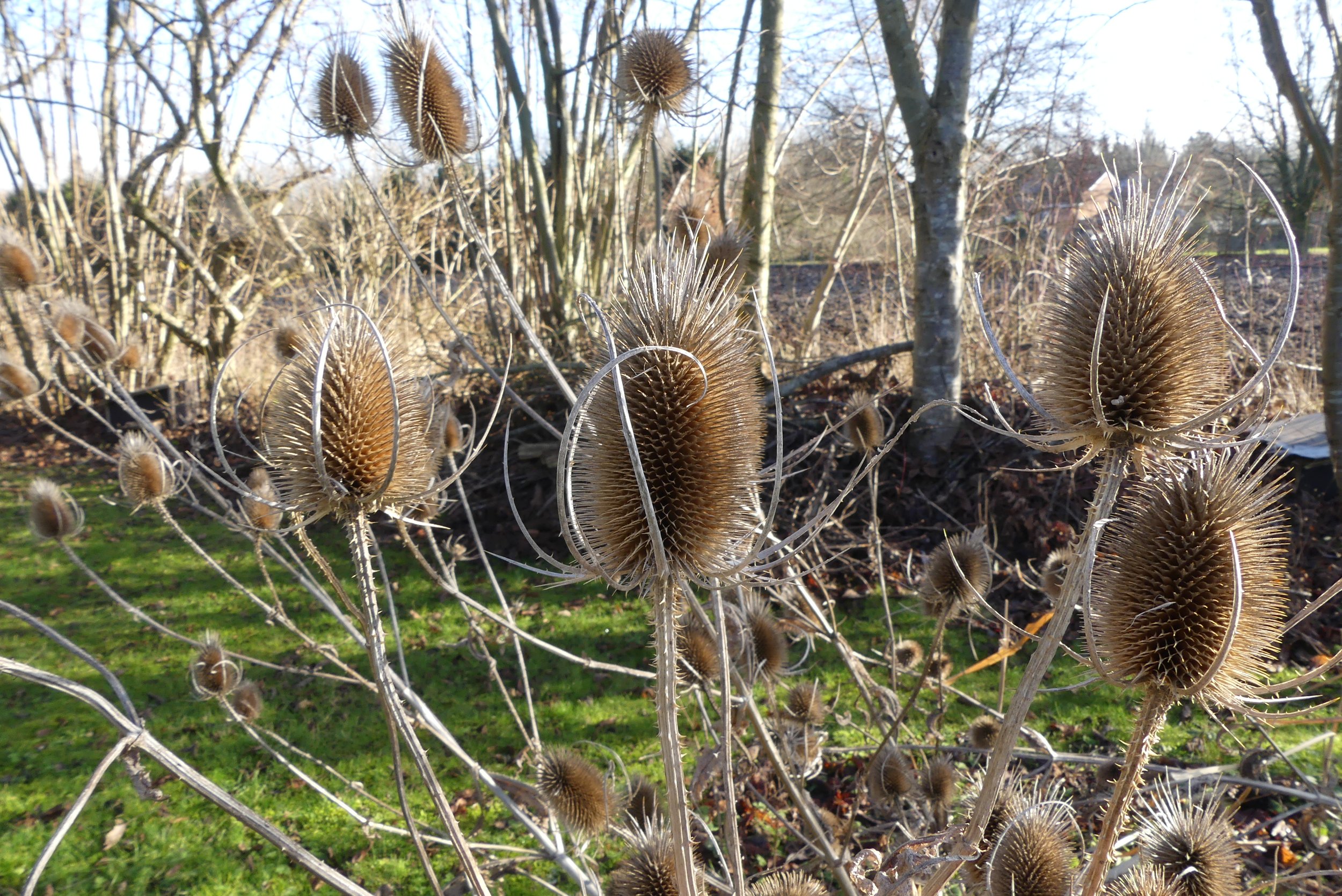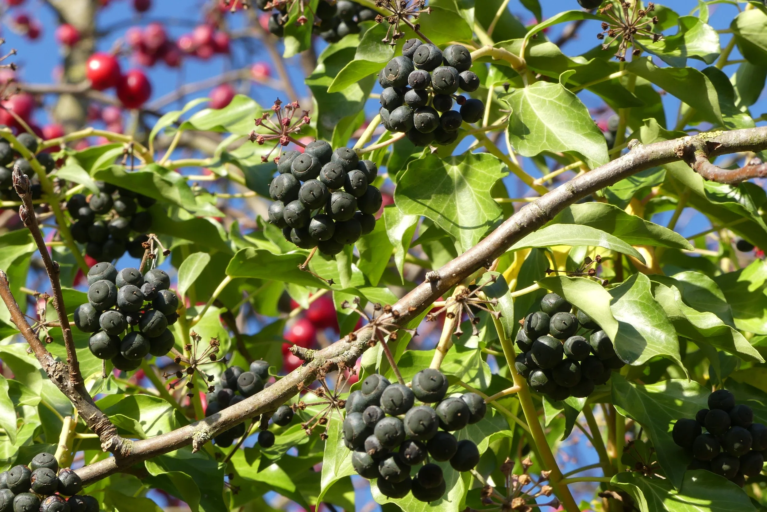 Quelques photos de plantes nourricières prises par Elodie Bernardello : petit pommier ornemental (fruits), lierre (fruits), cardère (graines).
